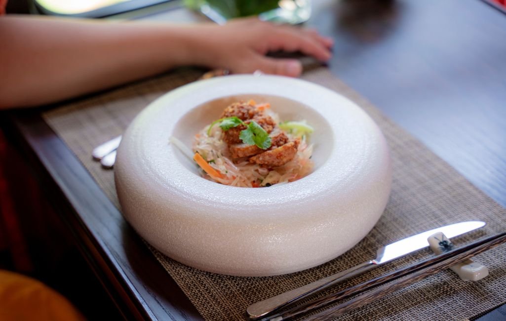 Its interiors draw inspiration from Indochine-era elegance, blending handcrafted wood, vintage flourishes, and soft lighting for a timeless ambiance.